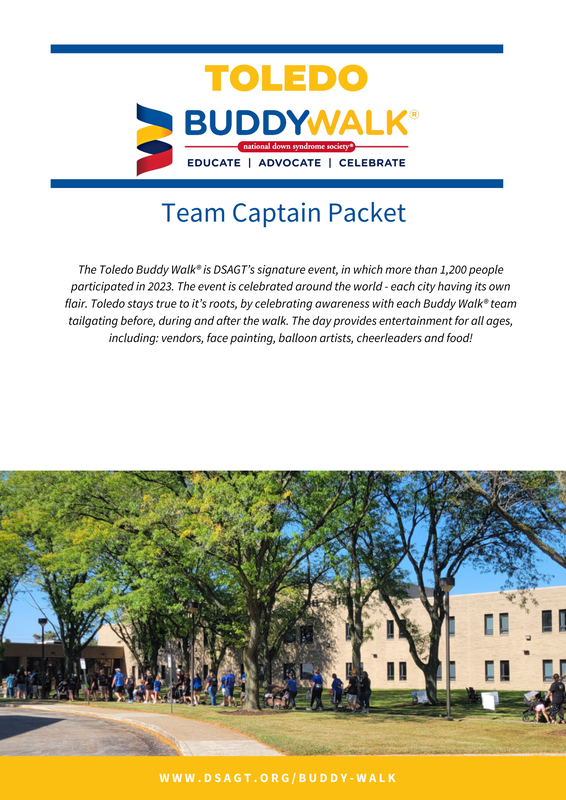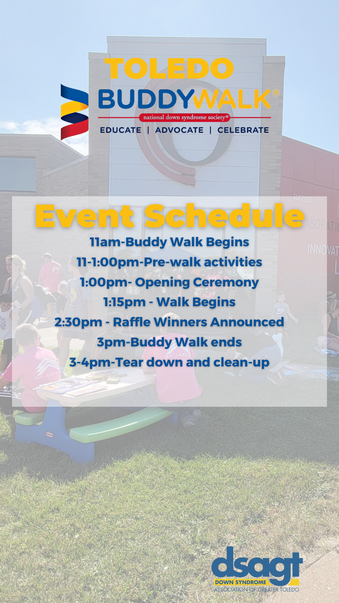 The Toledo Buddy Walk is back for it’s 24th year! This year is going to be bigger and better than ever and we can’t wait to have you join us on Sunday, October 5th from 11am to 3pm at Owens Community College! This year’s Buddy Walk will be a tailgate style, so bring your pop-up tents and chairs and we’ll provide the rest!